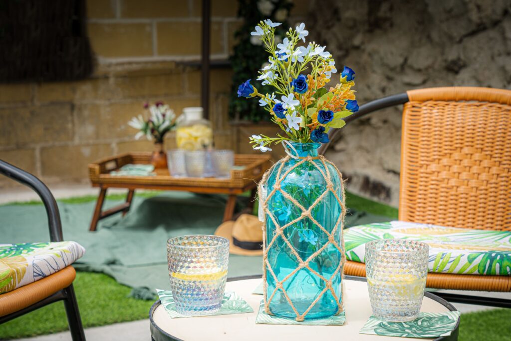 Zona de descanso con sombrilla y Bancos confortables realizados de palets, Zona Chill out.
