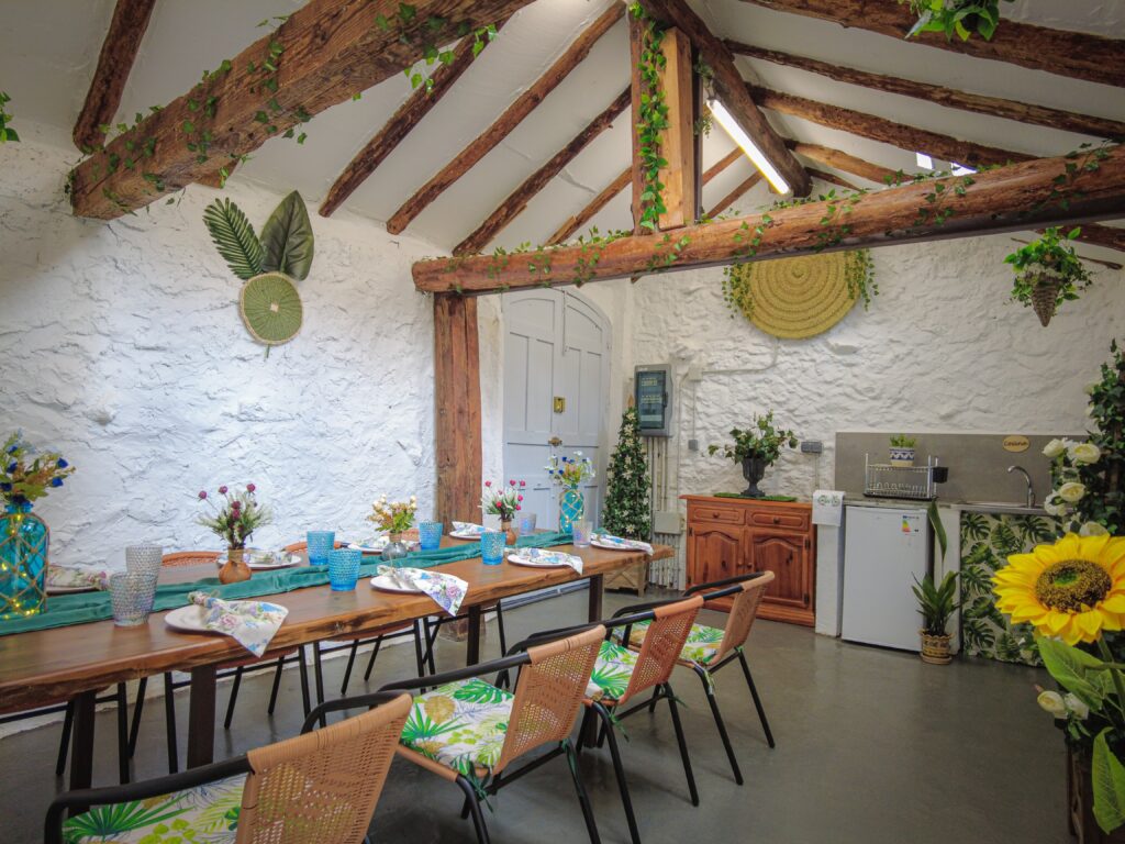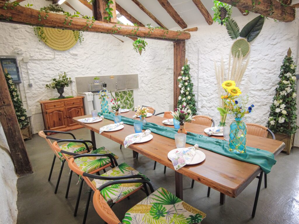 Amplia mesa de forja de hierro y Precioso azulejo hidráulico rustico y bancos de Madera.