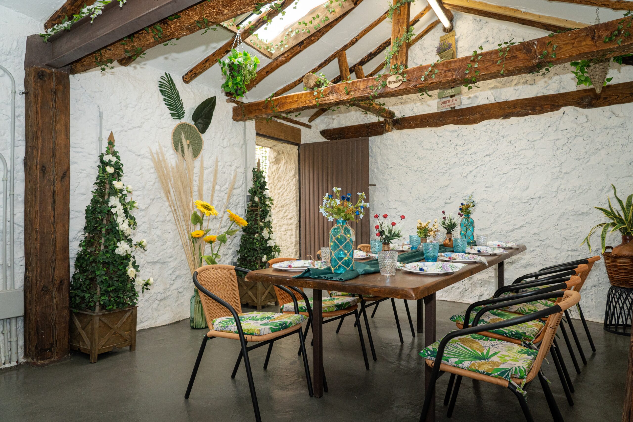 Amplia mesa de forja de hierro y Precioso azulejo hidráulico rustico y bancos de Madera.